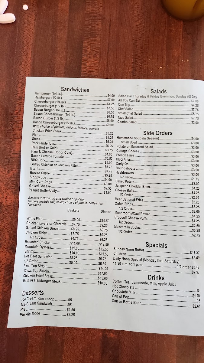 The menu offers a delightful array of choices: from breakfast favorites to an enticing Sunday buffet featuring 12 salads, two meats, and an assortment of homemade pies that leave guests raving. Signature specials like broasted chicken, mountain oysters, and juicy bacon cheeseburgers highlight regional flavors.